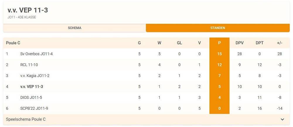 De laatste wedstrijd beloofde het spektakel stuk te worden. Tegenstander sv Overbos had de 10-1 gestuurd wat in de hoogste hoofdklasse JO10 uitkomt. De VEPPERS hielden lang stand, maar uiteindelijk bleek het verschil toch duidelijk. De 5-0 nederlaag was misschien wat geflatteerd, maar de wedstrijd was zeker de moeite waard.